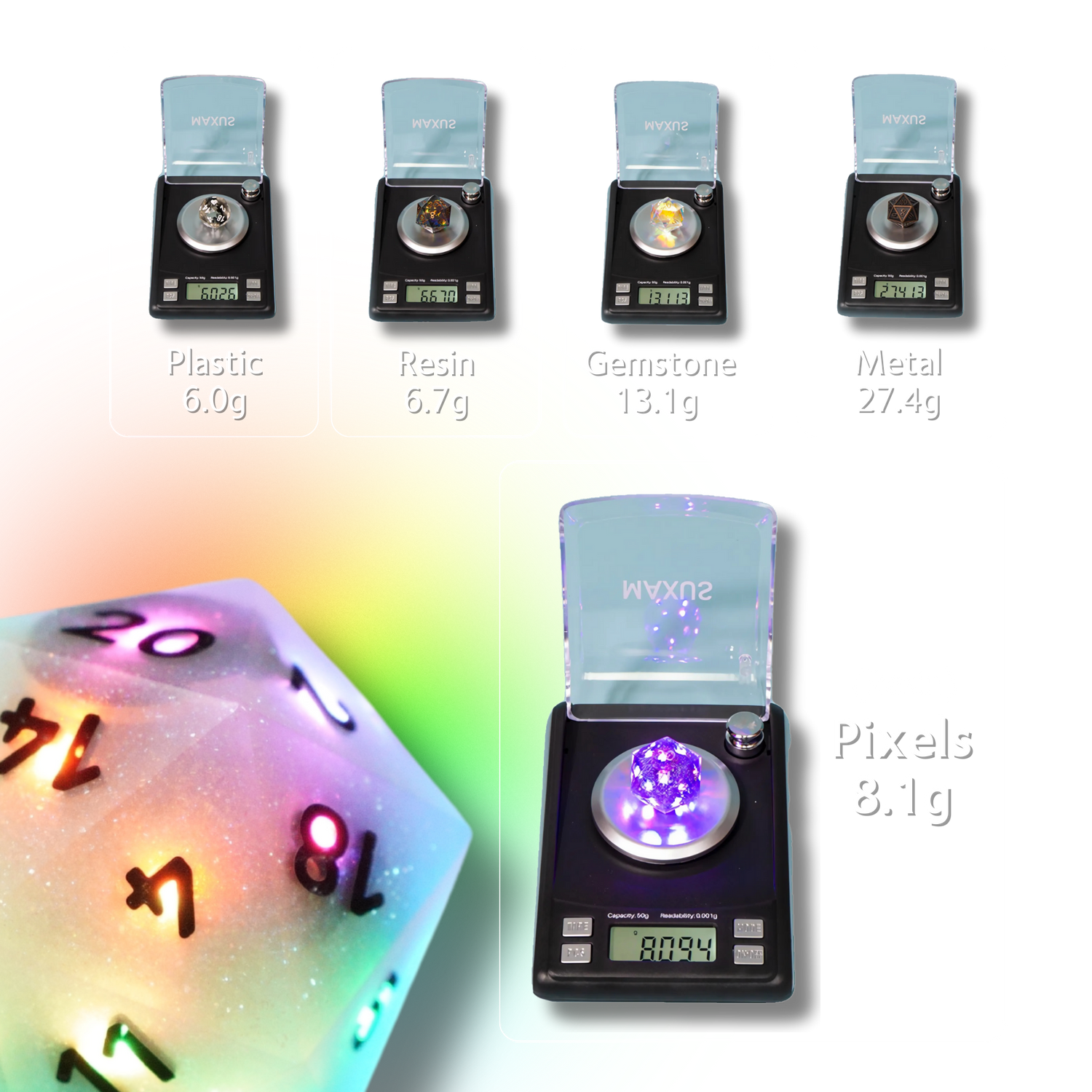 Weight | Min: 6g (D4) Max: 8g (D20) |