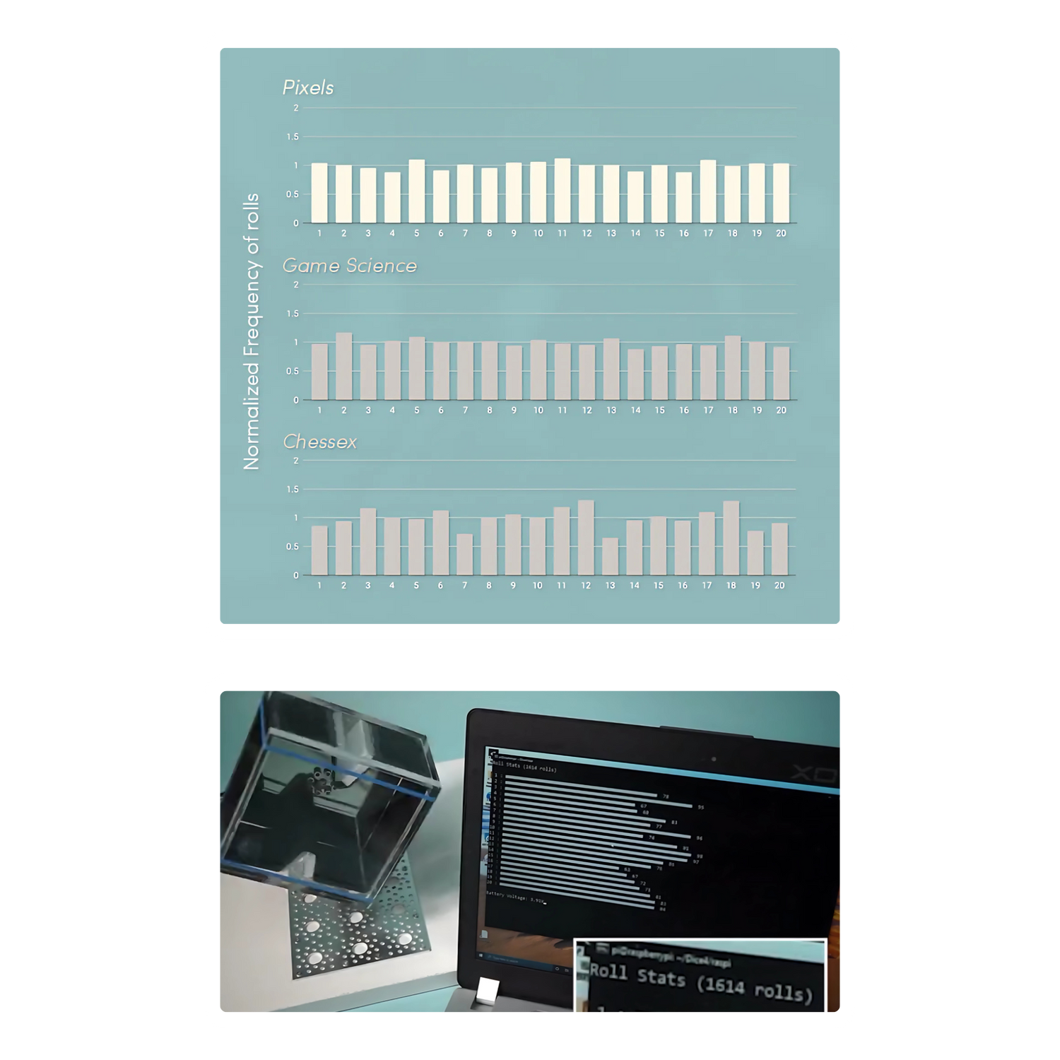 Since Pixels dice are more complex than regular dice, we’ve worked hard to ensure your dice will roll as fairly as possible. This means having all internal components in a central position when possible and adding counterweights as needed to account for additional mass on one side over another.